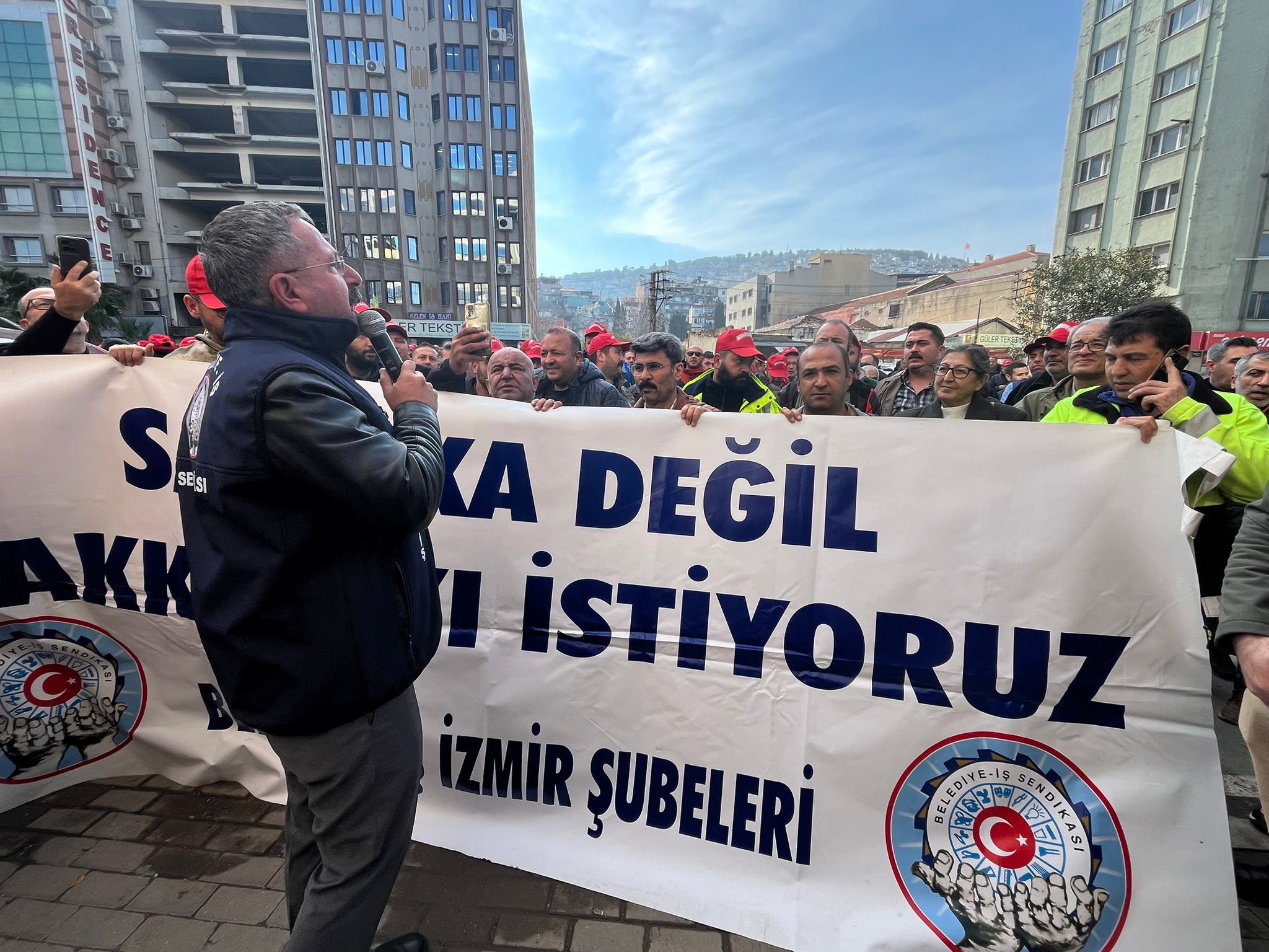 Belediye-İş İzmir 2 No'lu Şube Başkanı Savaş Atalay, “Bizden fedakarlık bekliyorlar. Yok artık fedakarlık. Bıçak kemikte. Burada emeğine ve ekmeğine sahip çıkan tüm arkadaşlarımı selamlıyorum. ” dedi.