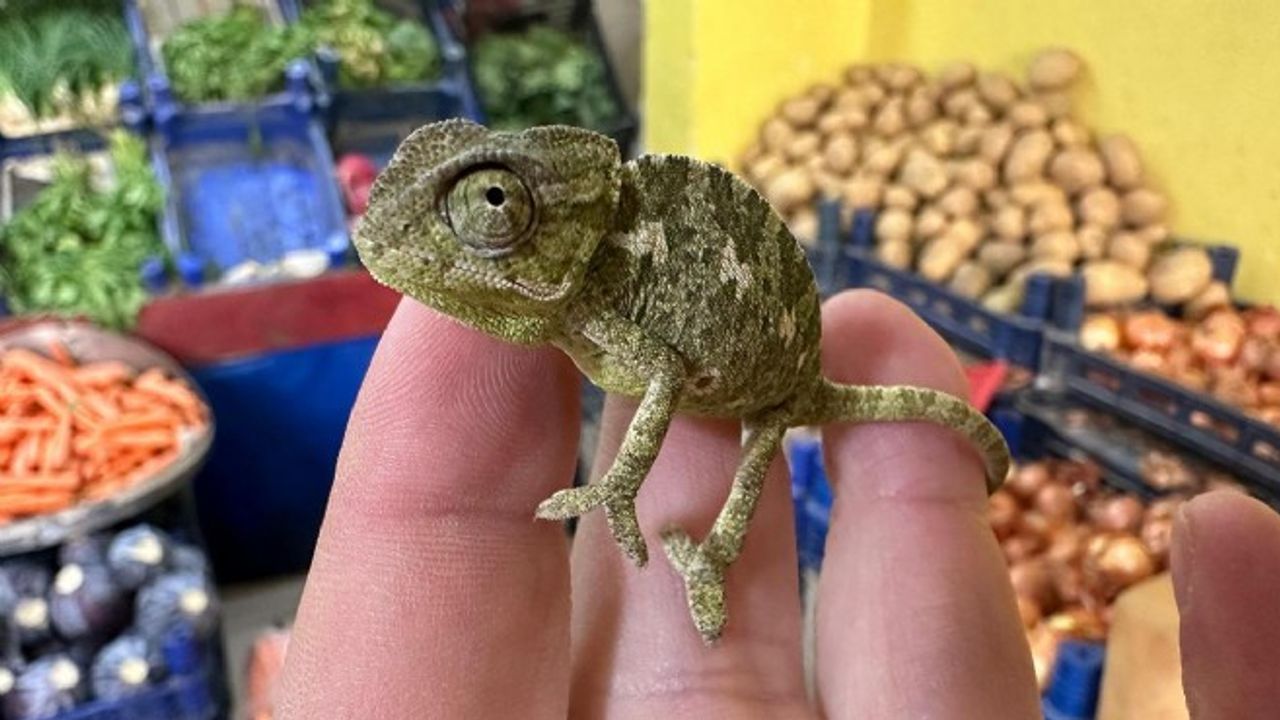 Öte yandan tezgahından bukalemun çıkan manav, mandalinaların bulunduğu kasaların üzerine, 'Dikkat bukalemun çıkabilir' yazısı koydu. (AA)