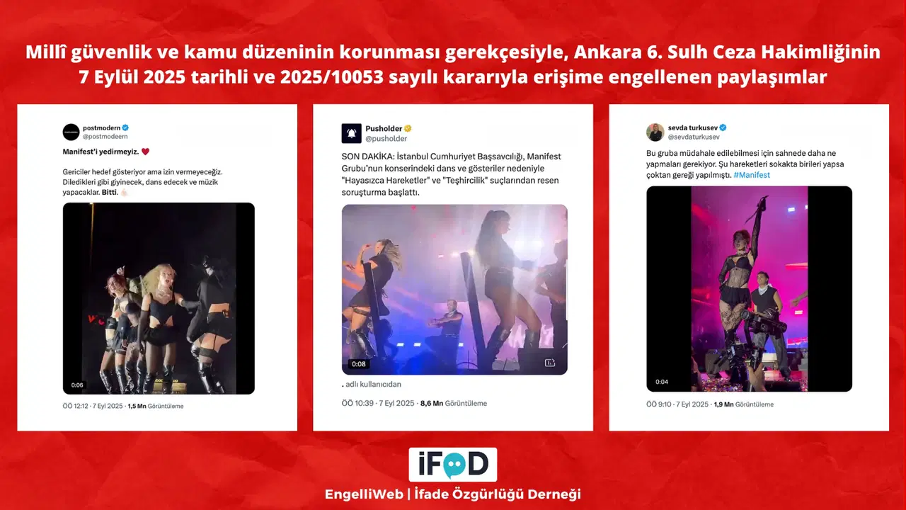 Öte yandan, İfade Özgürlüğü Derneği’nin (İFÖD) iddiasına göre, Küçükçiftlik Park’taki Manifest konserine ait görüntülerin yer aldığı X gönderileri, Ankara 6’ncı Sulh Ceza Hakimliği’nin 7 Eylül 2025 tarihli ve 2025/10053 sayılı kararıyla erişime engellendi.