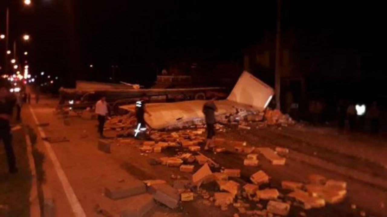 Kaza, saat 00.30 sıralarında İzmir-Ankara Karayolu 4 Eylül Stadyumu yakınlarında meydana geldi. İzmir'den Uşak yönüne giden Mahmut Temel (49) yönetimindeki plakası öğrenilemeyen gıda maddesi yüklü TIR, kontrolden çıkıp yol kenarındaki refüje çarparak devrildi. Yan yatıp, yaklaşık 100 metre sürüklenen TIR'ın şoförü Mahmut Temel ile çocukları Kübra (15), Evindar (15), Diyar Yavuz (14) ve Menal Temel (5), kazadan yara almadan kurtuldu. Temel ve çocukları, olay yerine sevk edilen ambulanslarla kontrol amaçlı hastaneye kaldırıldı.
