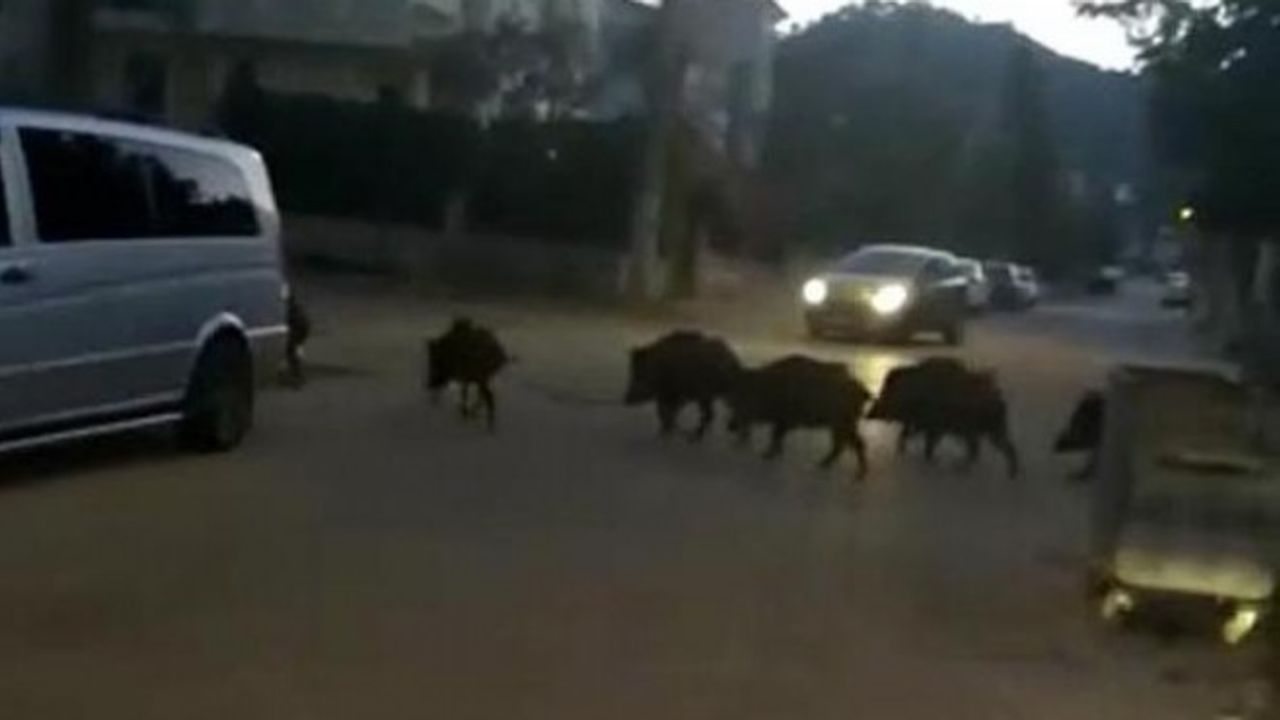 Armutalan Mahallesi'ndeki Tokatlılar Sitesi çevresine, dün saat 20.00 sıralarına yaban domuzları sürü halinde indi. Yüksek kesimlerden ilçeye inerek ana caddede araçların ve insanların arasından geçen yaban domuzları, çöp konteynerlerinin çevresinde dolaştı.