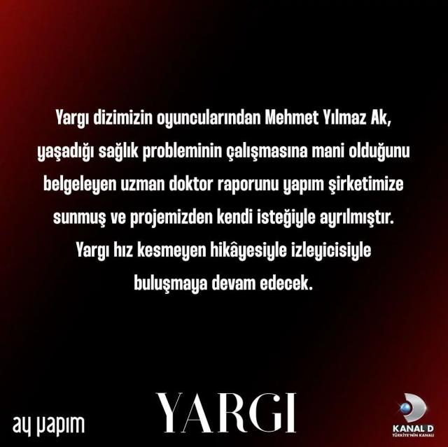 Veda haberinin duyulmasının ardından konuyla ilgili açıklama yapan Ay Yapım, 'Yargı dizimiz oyuncularından Mehmet YTılmaz Ak, yaşadığı sağlık probleminin çalışmasına mani olduğunu belgeleyen uzman doktor raporunu yapım şirketimize sunmuş ve projemizden kendi isteğiyle ayrılmıştır' denildi. Mehmet Yılmaz Ak ise konuyla ilgili herhangi bir açıklama yapmadı.