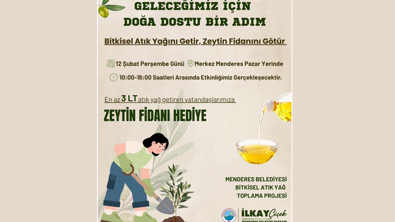 Menderes Belediyesi İklim Değişikliği ve Sıfır Atık Müdürlüğü, doğa için yeni bir kampanya başlatıyor. “Geleceğimiz İçin Doğa Dostu Bir Adım” sloganı ile duyurulan kampanyada bitkisel atık yağın getirene zeytin fidanı hediye edilecek. Her 3 litre yağ için bir fidan verileceği belirtildi. Yapılan duyuruda atık yağlar için toplama etkinliği gerçekleştirileceği ifade edildi. 12 Şubat Perşembe günü saat 10:00 – 16:00 arasında gerçekleşecek olan etkinlik Menderes Merkez Pazaryeri’nde yapılacak. Etkinlikte bitkisel atık yağlar teslim alınıp fidanlar teslim edilecek.