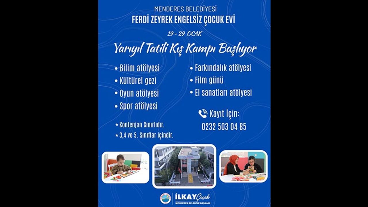 Menderes Belediyesi, yarıyıl tatilinde çocuklar için bir etkinlik daha düzenliyor. Kültür Sanat ve Sosyal İşler Müdürlüğü’nün düzenleyeceği Yarıyıl Tatili Kış Kampı 19-29 Ocak tarihleri arasında Menderes Belediyesi Ferdi Zeyrek Engelsiz Çocuk Evi’nde olacak. 3., 4. ve 5. Sınıflara giden çocukların katılabileceği kampta birbirinden eğlenceli etkinlikler düzenlenecek. Bilim atölyesi, farkındalık atölyesi, el sanatları atölyesi, oyun atölyesi, spor atölyesi ve film günü gibi etkinliklerle çocuklar keyifli vakit geçirecek. Yapılan duyuruda; kayıt için 0232 503 04 85 numaralı hattan kayıt yaptırılabileceği ifade edildi.
