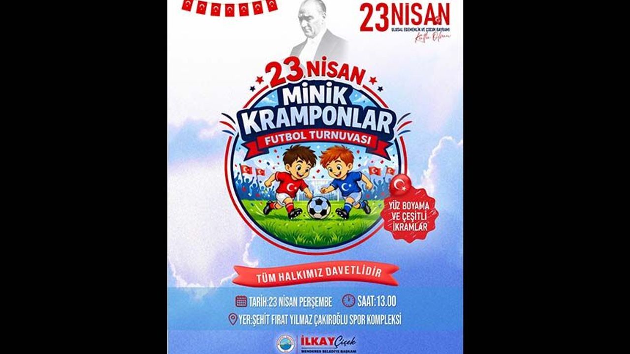 Menderes Belediyesi 23 Nisan Ulusal Egemenlik ve Çocuk Bayramı coşkusunu çocuklarla yeşil sahalara taşıyor. Menderes’te yer alan amatör spor kulüplerinin 2017 - 18 - 19 doğumlu minik takımlarının yer alacağı 23 Nisan Minik Kramponlar Futbol Turnuvası ulusal bayramla aynı gün Şehit Fırat Yılmaz Çakıroğlu Spor Kompleksi’nde düzenlenecek. Saat 13:00’da başlayacak olan spor etkinliğinde çocuklar için yüz boyama standı da yer alacak.