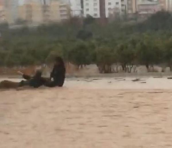 Merkez Mezitli İlçesi Fatih Mahallesi'nde Bakanlık Caddesi'nde bir kadın sel sularına kapıldı. Saat 11.00 sıralarında suda sürüklenen kadını görenler yardım için suya girdi. 3 kişi kadını suda yakalayıp, atılan ipi beline bağlayarak güçlükle kurtardı.
