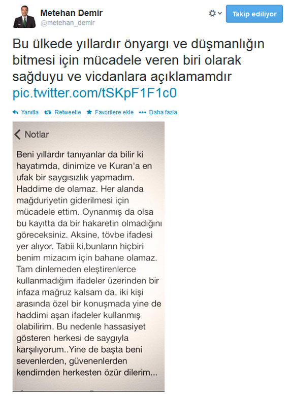 Bu ülkede yıllardır önyargı ve düşmanlığın bitmesi için mücadele veren biri olarak sağduyu ve vicdanlara açıklamamdır, diyerek twit paylaştı. Paylaştığı Twitte, 'Yine de başta beni sevenlerden, güvenenlerden kendimden herkesten özür dilerim..' ifadesi dikkat çekti. Konuşmayı kabul ediyor yorumlarını da beraberinde getirdi.
