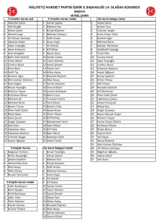 Kongrede divan üyeliğine MHP Genel Başkan Yardımcısı ve İstanbul Milletvekili Prof.Dr. Semih Yalçın, İzmir Milletvekili Genel Sekreter Yardımcısı Tamer Osmanağaoğlu, MYK Üyesi Burak Pehlivan, Aliağa Belediye Başkanı Serkan Acar seçildi.