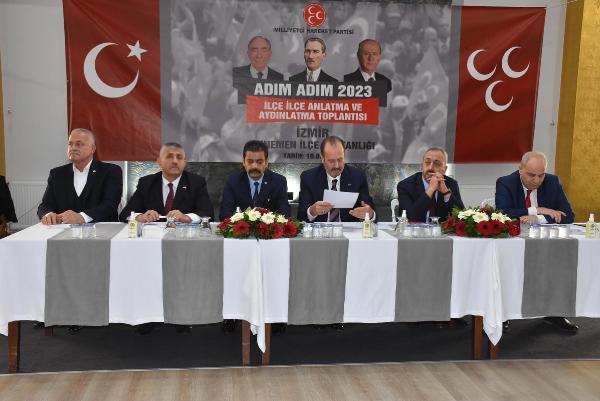 MHP İl Başkanı Veysel Şahin de konuşmasında Türkiye'nin 125 ilçesinde İzmir'in ise 25 ilçesinde ramazan ayına kadar toplantılar yapmaya devam edeceklerini belirterek MHP'liler ve Cumhur İttifakı olarak sahalara indiklerini dile getirdi. Bayraklı'dan başladıkları hareketi Menemen'de sürdürdüklerini anlatan Şahin, 'Zilletin işbirlikçilerinin oyunlarını bozmaya hazır olduğumuzu, teşkilatlarımızın diri ve ayakta olduğunu görmekten mutluyuz. Cumhuriyetimizin ikinci yüzyılına yön verecek olan 2023 vizyonunun akamete uğratılmasına asla müsaade etmeyiz. Esnafımızın, vatandaşımızın, çiftçimizin sıkıntıları var biliyoruz. Son 3 aydır sıkıntılar yaşadığımızın farkındayız. En kısa sürede bunları çözeceğiz inşallah. Milletimize domates, salatalık üzerinden ayar verilmesine müsaade etmeyeceğiz' dedi.