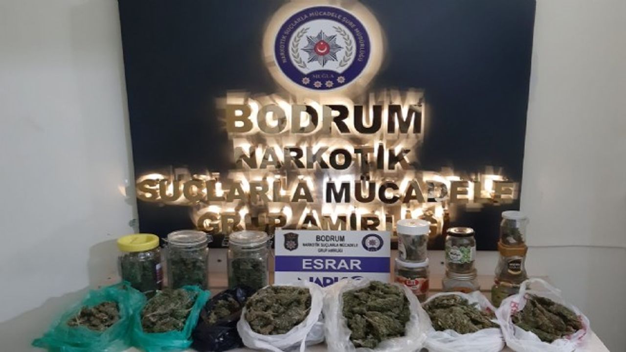 Aramada poşet ve kavanozlarda 3 kilo 700 gram esrar ile bir kök kenevir bulundu.