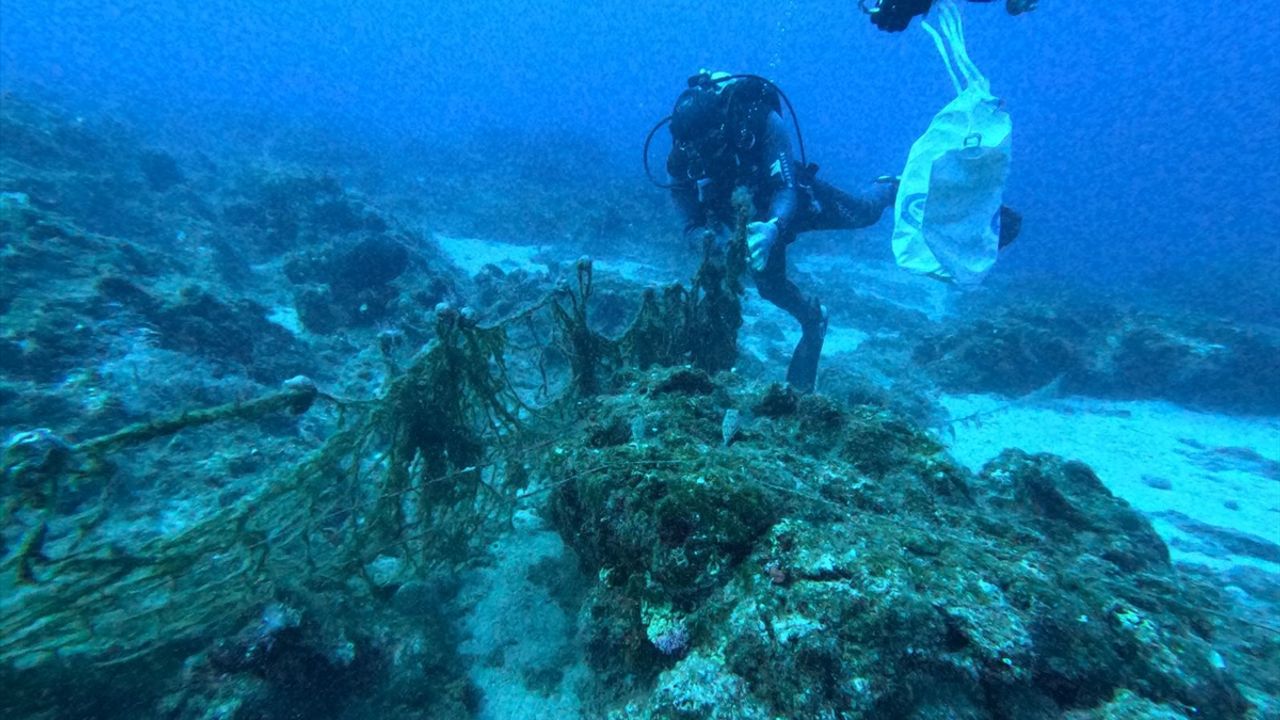 Denizde 10 yıldan fazladır bulunduğu tahmin edilen ağlar, çevresindeki misinalarla birlikte toplanarak yüzeye çıkarıldı.