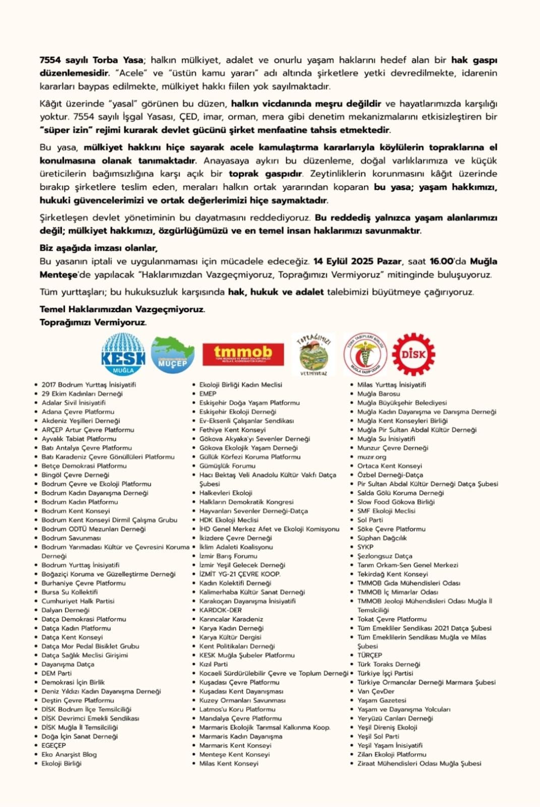 Kampanya bileşenleri, Temmuz 2025’te yürürlüğe giren 7554 Sayılı Bazı Kanunlarda Değişiklik Yapılmasına Dair Kanun’a karşı yürüttükleri çalışmalar kapsamında, “Temel Haklarımızdan Vazgeçmiyoruz, Toprağımızı Vermiyoruz” mitinginin 14 Eylül Pazar günü Muğla’da yapılacağını duyurdu.