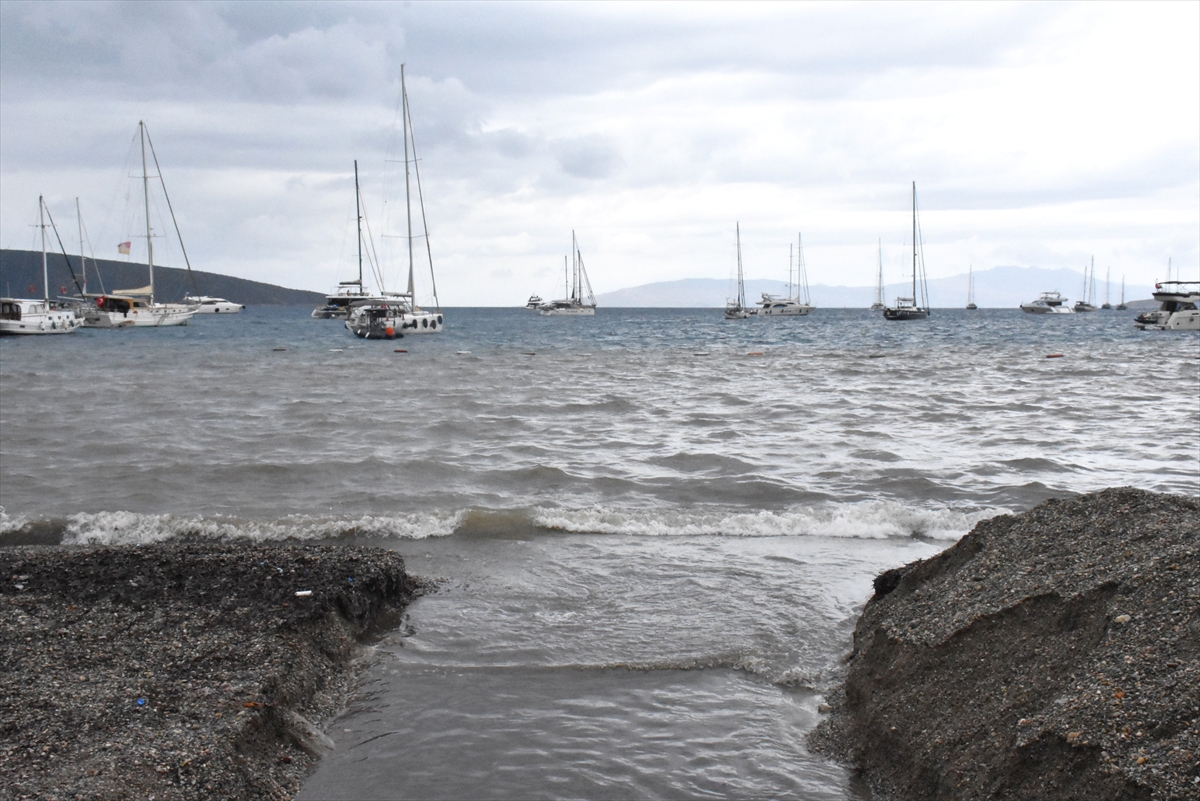 Bodrum ilçesinde aralıklarla sağanak etkili oldu. Yollarda su birikintileri oluştu. Denize ulaşan çamurlu yağmur suları nedeniyle kıyıya yakın yerde denizin rengi değişti.