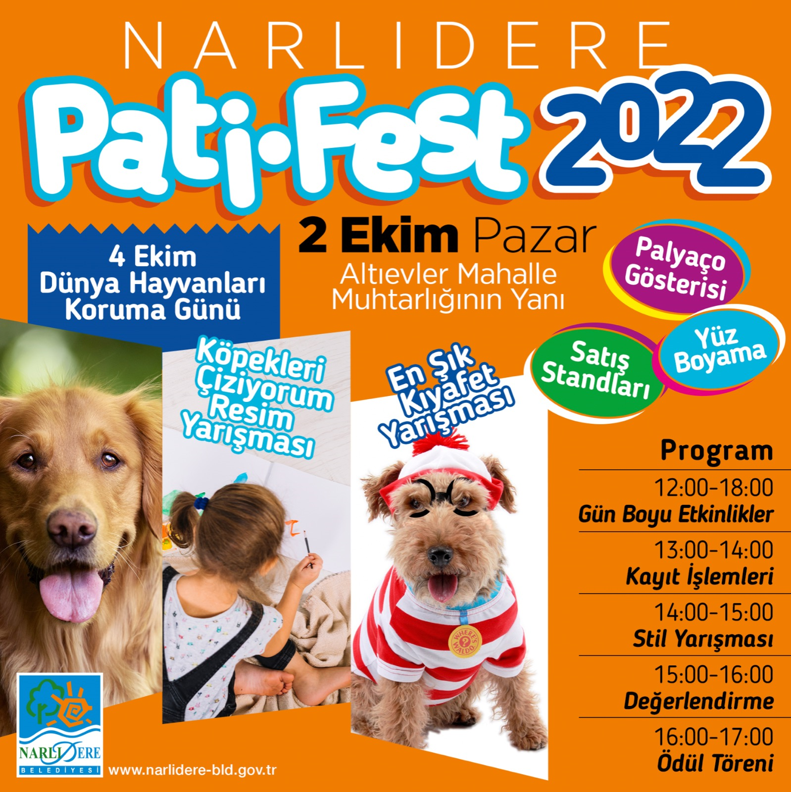 Hayvan hakları ve sahiplendirme konusunda farkındalık yaratmak, hayvan sevgisini gelecek nesillere aşılamak amacıyla Narlıdere Belediyesi tarafından düzenlenen Pati-Fest 2022 bu sene de renkli görüntülere sahne olacak. Dünya Hayvanları Koruma Günü kapsamında 2 Ekim Pazar Günü Sahilevleri Altıevler Mahallesi Muhtarlığı yanında gerçekleştirilecek festival, hayvan dostlarını bir araya getirecek. Gün boyu sürecek festivalde 'En Şık Kıyafet Yarışması' ve 'Köpekleri Çiziyorum Resim Yarışması' düzenlenecek. Festivalde ayrıca, satış stantları, palyaço gösterileri ve yüz boyama etkinlikleri yapılacak. Saat 12.00-18.00 saatleri arasında havyan severleri bir araya getirecek Pati-Fest'te, can dostlarımız için sahiplendirme çalışmaları da yapılacak.