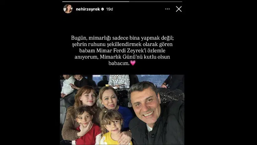 Zeyrek paylaşımında “Bugün, mimarlığı sadece bina yapmak değil; şehrin ruhunu şekillendirmek olarak gören babam Mimar Ferdi Zeyrek'i özlemle anıyorum, Mimarlık Günü'nü kutlu olsun babacım" ifadelerine yer verdi.