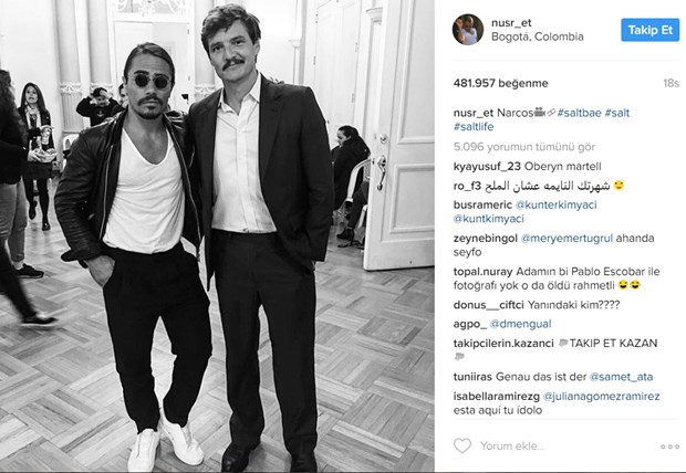 Paylaştığı videolarla fenomen haline gelen ve ünü sınırları aşan Nusret Gökçe Kolombiya'ya gitti. Gökçe, dünyanın en çok konuşulan dizilerinden olan Narcos'un setinde ortaya çıktı. Nusret, dizinin başrol oyuncularından Pedro Pascal ile yer aldığı fotoğrafı Instagram sayfasında yayınladı.