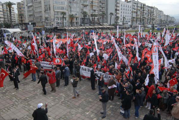 İZMİR - Konak Meydanı tarihi Saat Kulesi önünde partililerle buluşan HEPAR Genel Başkanı Osman Pamukoğlu, Gündoğdu Meydanı'na kadar yürüdü. Burada kendisini dinleyen yaklaşık 3 bin kişiye seslenen Pamukoğlu, milletin, sahte dinciler, sahte Atatürkçüler ve kuru sıkı milliyetçilerden kendisini kurtaramadığı sürece, siyasi ve ekonomik düzlüğe çıkamayacağını söyledi.