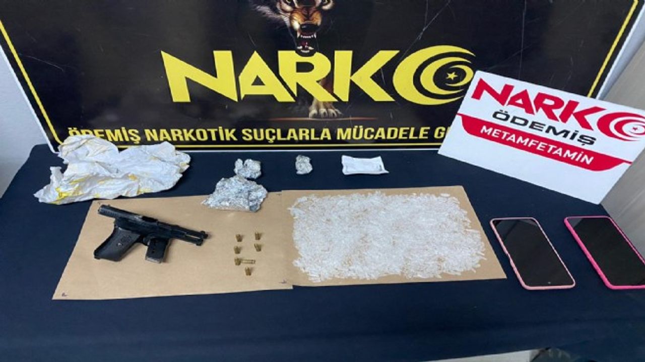 Alınan bilgiye göre, ihbarı değerlendiren Ödemiş Narkotik Grup Amirliği ekibi, ilçe girişinde bir taksiyi durdurdu. Takside yolcu olarak bulunan R.A'nın üst aramasında bir miktar metamfetamin ile ruhsatsız tabanca bulundu.