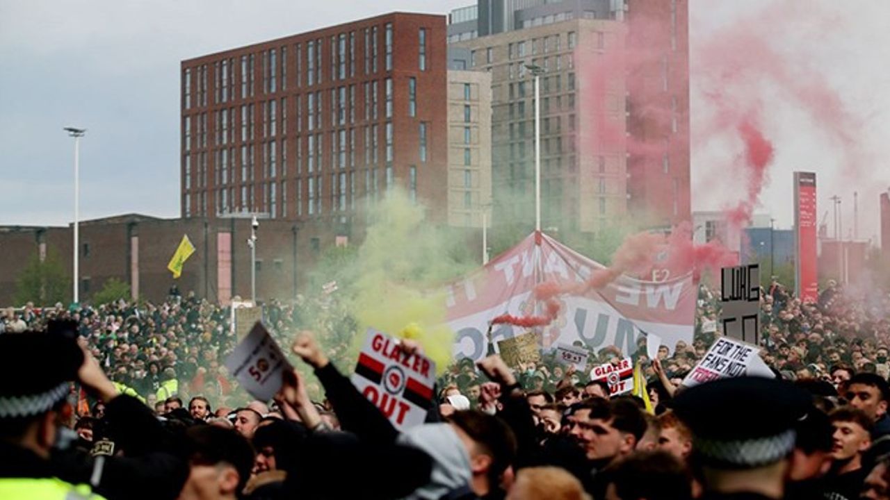 Ligin 34. haftasında bugün TSİ 18.30'da oynanması planlanan Manchester United-Liverpool öncesi, Manchester ekibinin taraftarları Old Trafford Stadı önünde protesto gösterisi düzenlemişti.