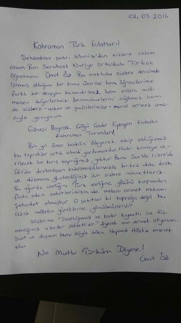 Öğretmen Ümit Öz, mektup fikrinin öğrencilerden geldiğini belirterek, 'Fikri ilk duyduğumda ben de çok duygulandım. Öğrencilerimle birlikte duygularımızı kaleme aldık. Bu mektuplarda öğrencilerimiz o bölgelerde görev yapan askerlerimize ve emniyet mensuplarına moral veriyor. Tek temennimiz bölgede devam eden terör saldırılarının bir an önce sona ermesi ve ülkemizde barış ortamının yeniden sağlanmasıdır' diye konuştu.