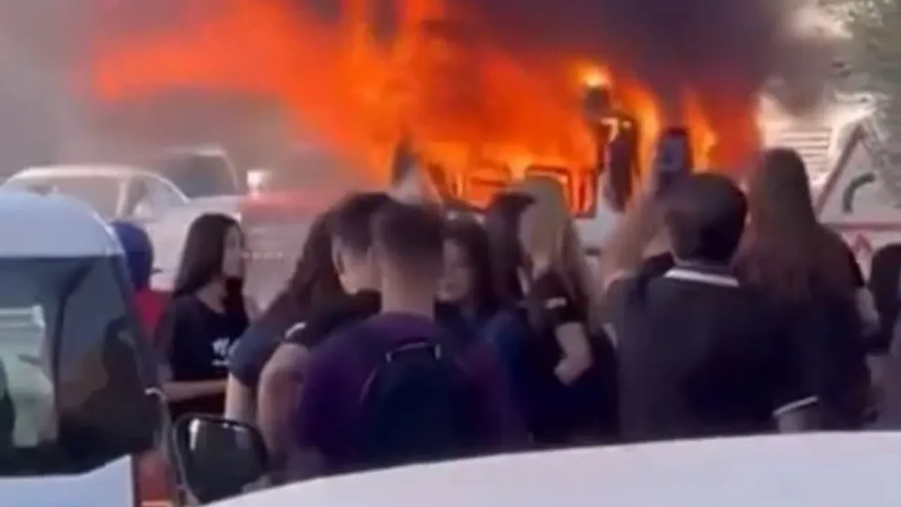 Öğrencilerin panik hali yaşadığı serviste alevleri fark eden sürücü, aracı durdurdu ve 112 Acil Çağrı Merkezi'ne haber verdi.
