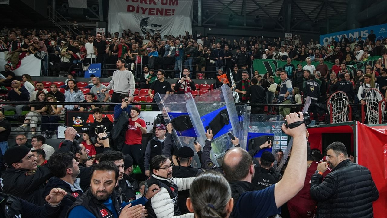 Galatasaray MCT Technic oyuncuları da soyunma odasına giderken taraftarların sahaya attığı yabancı maddelerden korunmaya çalıştı.