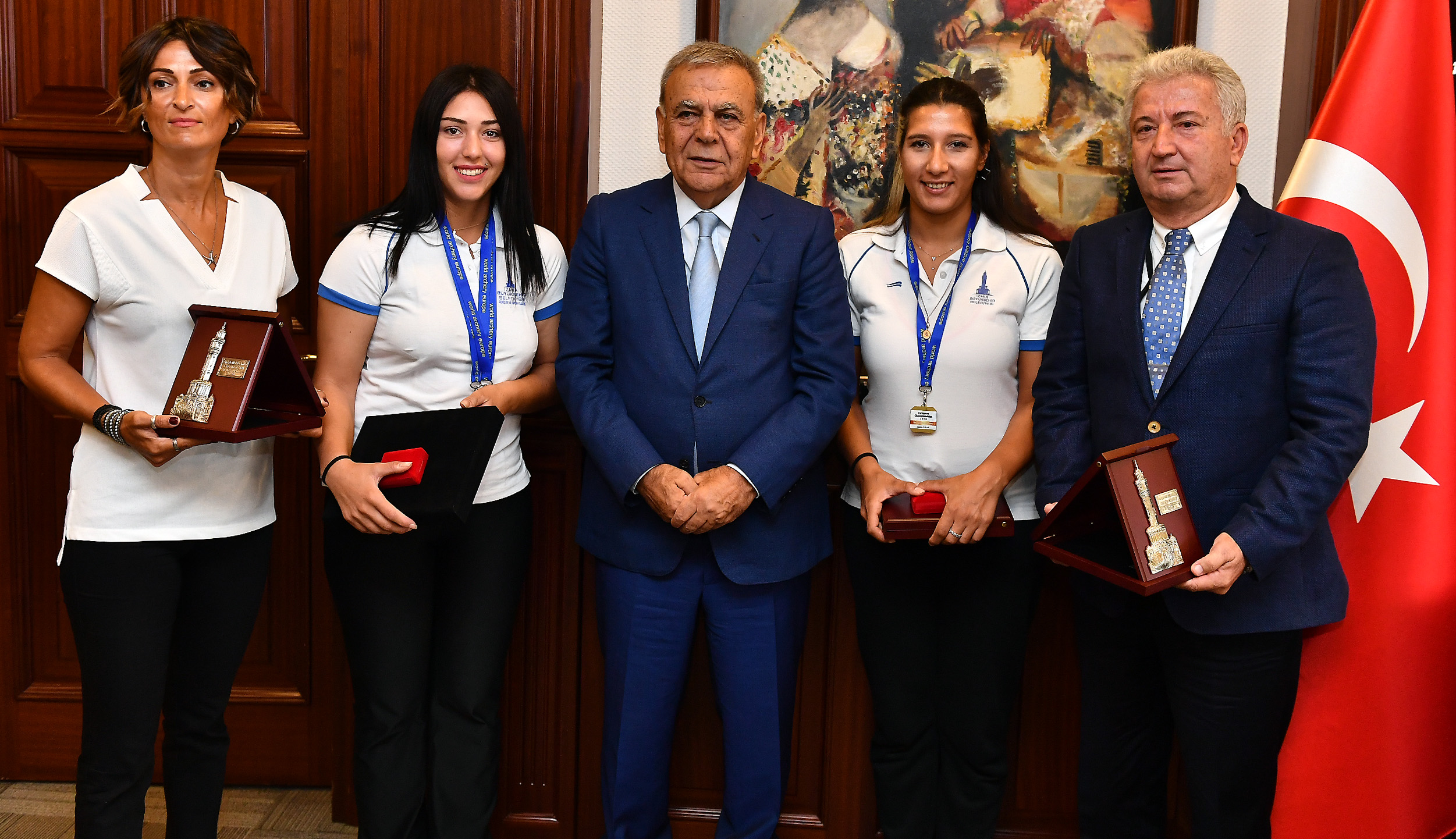 İzmir Büyükşehir Belediye Başkanı Aziz Kocaoğlu, Türkiye Klasik Yay Kadın Milli Takımı, Avrupa Okçuluk Şampiyonası'nda altın madalya kazanan İzmir Büyükşehir Belediyesi Spor Kulübü sporcuları Yasemin Ecem Anagöz ve Aybüke Aktuna'yı makamında ağırladı.