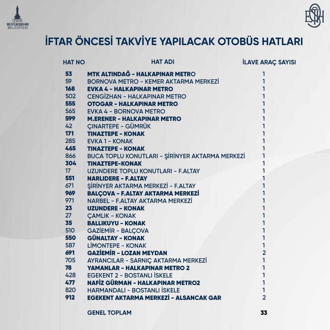 EGEDESONSÖZ- İzmir Büyükşehir Belediyesi, koronavirüs pandemi döneminde Ramazan ayının da başlamasıyla iftar saatlerinde otobüslerde yoğunluk yaşanmaması adına ek seferlerle hatları besleme kararı aldı.