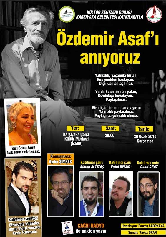 ''Benim babamı 'görmez'liğim devam ediyor. Ama Özdemir Asaf yaşıyor'' diyen sanatçının kızı Seda Arun, Kültür Kentleri Birliği ve Karşıyaka Belediyesi'nin katkılarıyla düzenlenen anma etkinliğine İzmirliler'i davet etti.