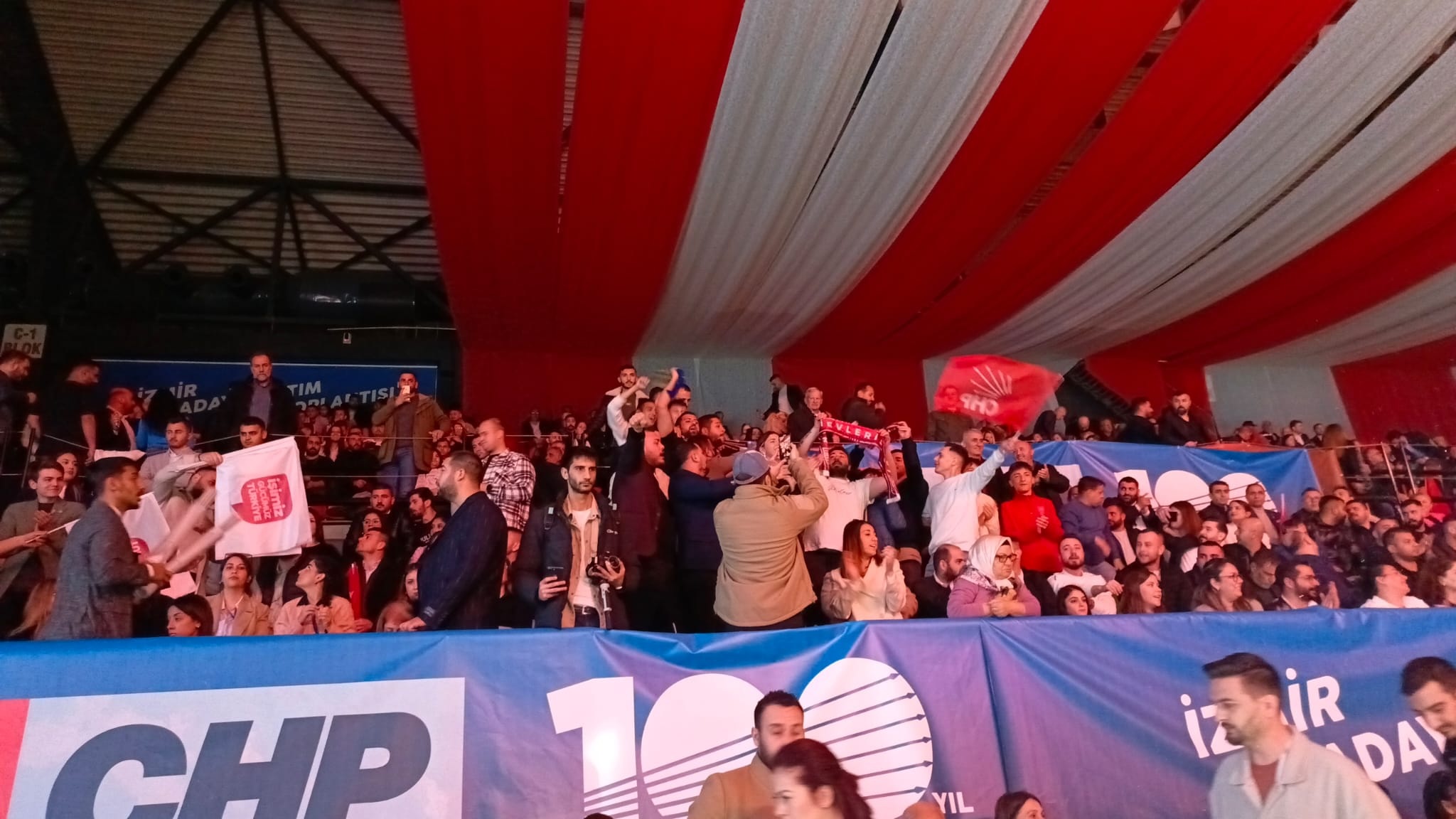 Genel Başkan Özgür Özel, bugün Karşıyaka Mustafa Kemal Atatürk Spor Salonu'da aday tanıtım toplantısına katıldı. Partililer kendilerine ayrılan yerleri doldurdu. Salonda 'İşimiz gücümüz Türkiye', 'Hep birlikte İzmir için daha ileriye' yazılı pankartlar görüldü.