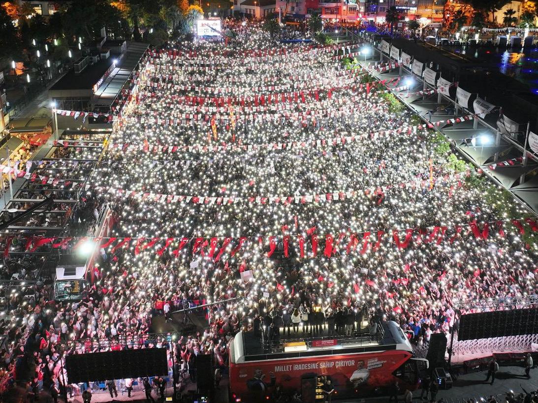 “Bu korkakları tarihin çöp sepetine atıyorum. Yolda yürürken ‘Bana omuz attılar’ diyenlere, ‘Nezaketsiz, beceriksiz, çirkin insanlar bunlar’ dediklerine, sana ‘İki yüzlü’ deyip hakaret edenlere, mazbatanı yemekhanede verenlere, her fırsatta sana hakaret edenlere korkup sığınıp, topukladın ya tarihin çöp sepetinde kal, artık Aydın’ın gündeminde sen yoksun. Sen korktuğun için kaçtın. Ama bundan sonra hayatın boyunca kaçtığın için korkmaya devam edeceksin. Biz de senin peşinde olacağız. Aydın’ı hırsızlayan Erdoğan’a sesleniyorum. 20 yıldır Aydın’ı kazanamadın, bir daha da kazanamayacaksın. Meclis üyelerimiz, 10 belediye başkanımız dimdik ayaktadır. Bu süreçte Aydın’da belediye meclis çoğunluğu Cumhuriyet Halk Partisi’ndedir. Seçim sonuçları ortadadır. Aydın’ın iktidarı Cumhuriyet Halk Partisi’dir. Şimdi bu muhteşem meydandan iğne atsan yere düşmeyen bu meydandan dronlar hazırsa, cep telefonları hazırsa Türkiye’ye bir sürprizimiz var. Yansın ışıklar. Otobüsün üstündeki Aydın milletvekillerimize, il başkanımıza, bütün Aydın belediye başkanlarımıza, Ege’nin Efe’si belediye başkanlarıma, büyükşehir ve il belediye başkanlarıma selam olsun, Efeler Diyarı’na.