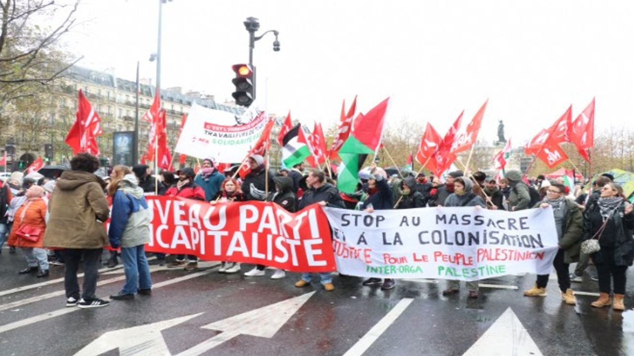 Paris'te kötü hava koşullarına ve şiddetli yağışa rağmen Cumhuriyet Meydanı'nda toplanan Filistin destekçisi Parisliler, Gazze'de bir an önce ateşkes sağlanması talebiyle Millet Meydanı'na kadar yürüdü.