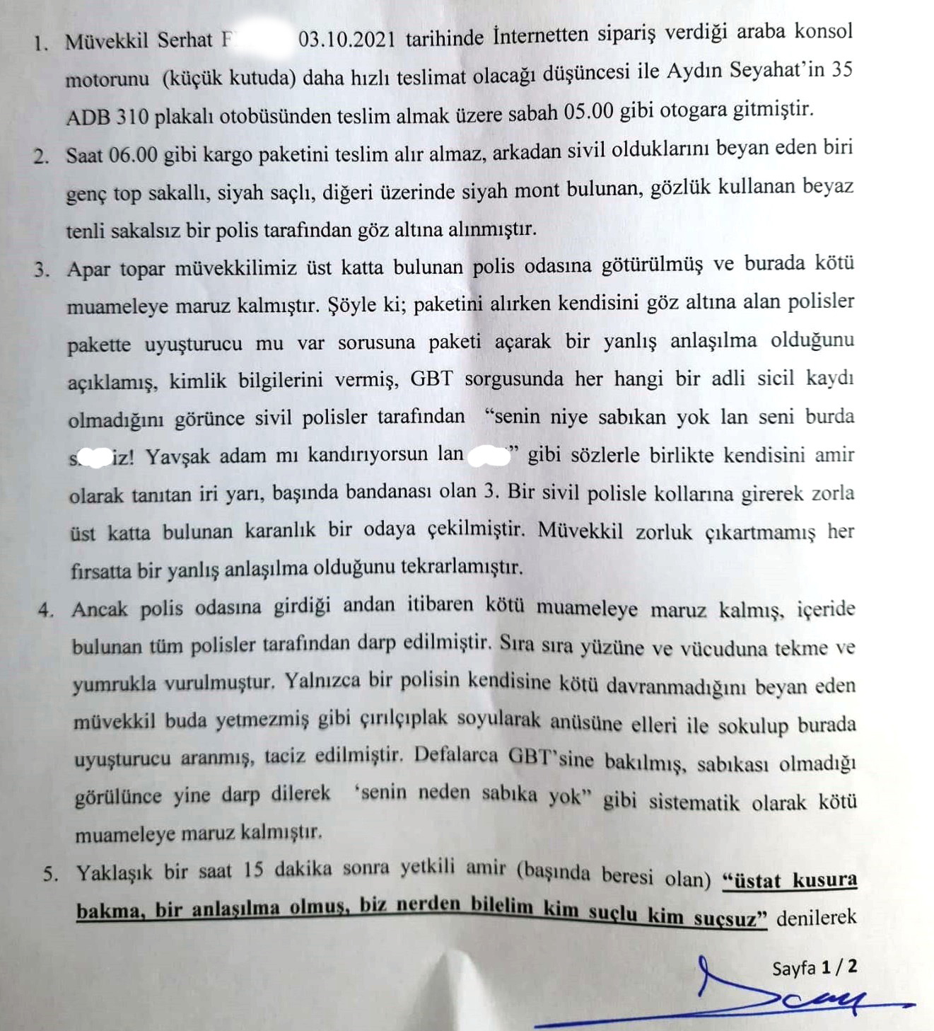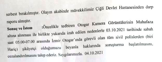 EGEDESONSÖZ- İzmir'in Çiğli İlçesi Şirintepe Mahallesi'nde yaşayan Serhat F., isimli vatandaş internetten sipariş verdiği araba konsol motorunu teslim almak için sabaha karşı 05:00 sularında İzmir Şehirlerarası Otobüs Terminali'ne gitti. Burada otobüsten paketi almak üzereyken yanına gelen iki sivil polis gözaltı işlemi yaptı. Serhat F., otogarda polisler tarafından kötü muameleye maruz kaldığını söyleyerek İzmir Cumhuriyet Savcılığı'na suç duyurusunda bulundu. Tehdit, hakaret, kötü muamele, darp gibi eylemlerden şikayetçi olan Serhat F. avukatı Fikret Atbaş vasıtasıyla yaptığı başvuruda çırılçıplak soyularak cinsel istismara maruz kaldığını iddia etti. Çiğli Eğitim ve Araştırma Hastanesi'nden darp raporu alan Serhat F., otogar kamera görüntüleri ve olaya ilişkin deliller incelendiğinde gerçeğin ortaya çıkacağını belirtti.