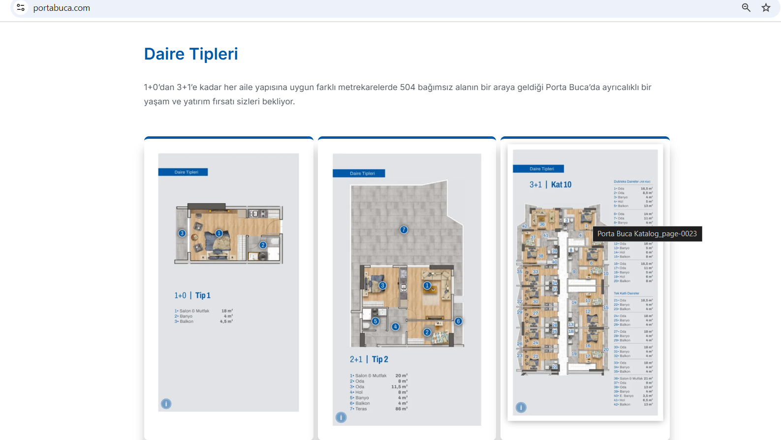 Daire görsellerinin yer aldığı proje tanıtım sitesinde “Porta Buca İzmir’in yatırım değeri sürekli artan en kalabalık şehri Buca’da 18 bin metrekare alan üzerinde; 3 blok, 1+0, 1+1, 2+1 v e 3+1 daire tiplerinin yer aldığı 504 adet bağımsız bölümüyle sizlere hem konforlu bir yaşam alanı hem de karlı bir yatırım fırsatı sunuyor” ifadeleri yer alıyor.