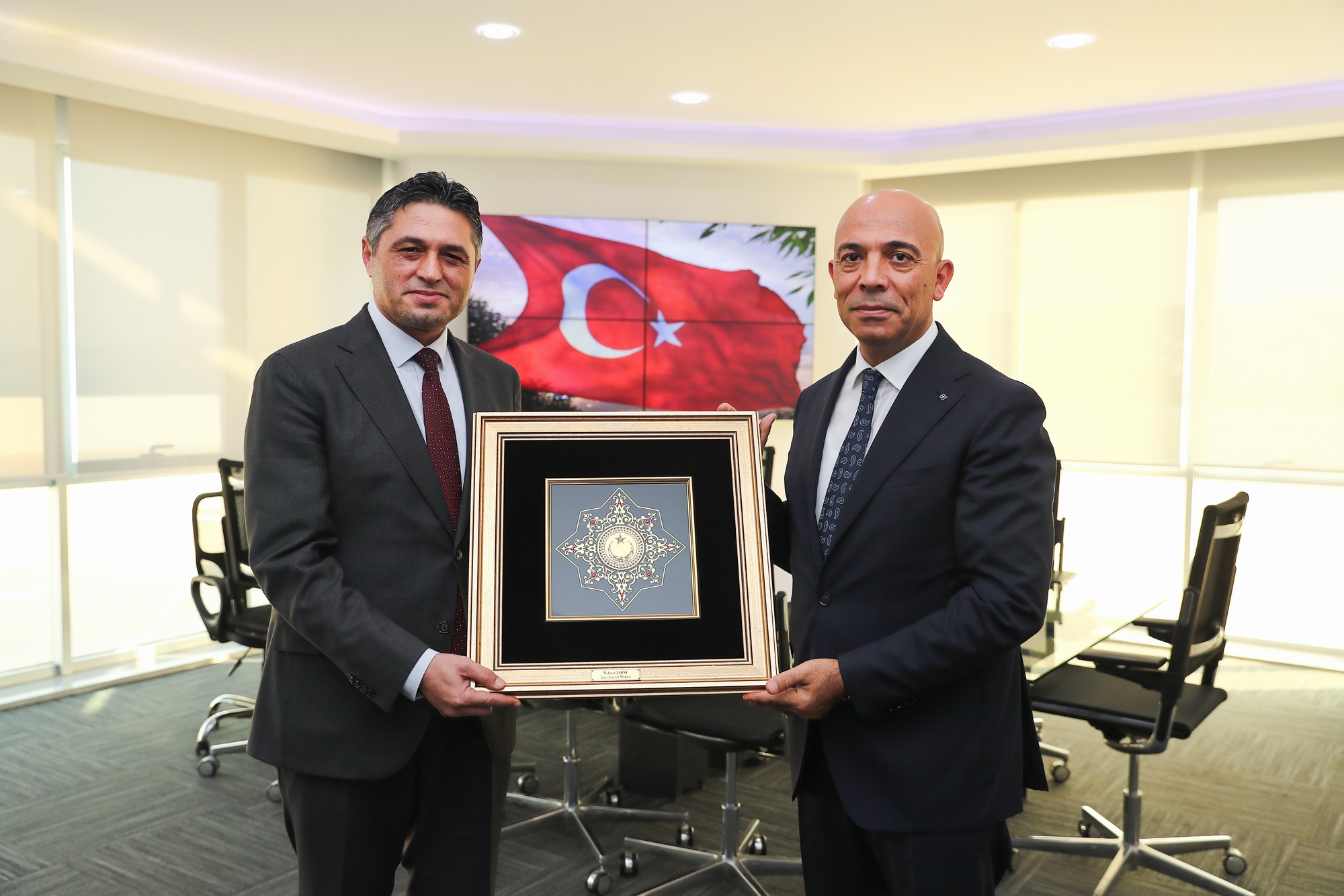 İzmir İl Emniyet Müdürü Mehmet Şahne, başkanlık makamında imzalanan protokol sonrası günün anısına Aliağa Belediye Başkanı Serkan Acar'a ay yıldız motiflerinden oluşan tablo hediye etti.