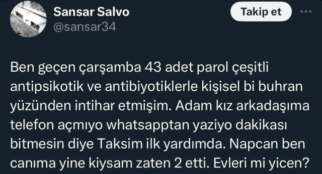X hesabından yaptığı paylaşımda eski kız arkadaşı, babası ve ailesinin de dahil olduğu olayları öfkeli bir dille anlatan Arslan, 'Ben geçen çarşamba 43 adet ilaç çeşitli antipsikotik ve antibiyotiklerle kişisel bir buhran yüzünden intihar etmişim. Adam kız arkadaşıma telefon açmıyor WhatsApp'tan yazıyor dakikası bitmesin diye Taksim ilk yardımda. Ne yapacaksın ben canıma yine kıysam zaten 2 etti. Evleri mi yiyeceksin?' dedi.