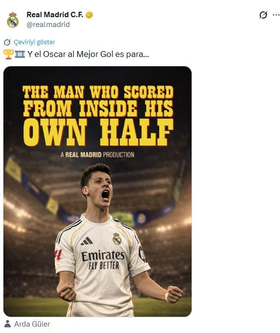 Paylaşımda Arda Güler'in İspanya LaLiga'da Real Madrid'in Elche'yi 4-1 mağlup ettiği maçtaki golüne yer verildi. TSİ gece 01.31'da yapılan paylaşımında, "Ve en iyi gol Oscar'ı… Bir Real Madrid yapımı. Kendi sahasından gol atan adam" ifadelerine yer verildi.
