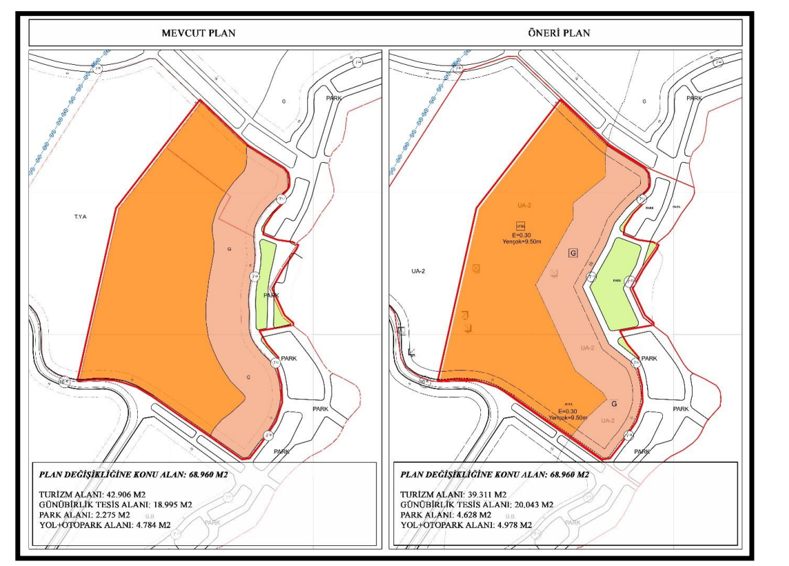 Plan değişikliğinin ana gerekçesi ise kıyı kenar çizgisi ile ilgili çakışma oldu. Yeni planla birlikte turizm alanı 42 bin 906 metrekareden 39 bin 311 metrekareye indirilirken günübirlik tesis alanı ve park alanında kısmı artışa gidildi.