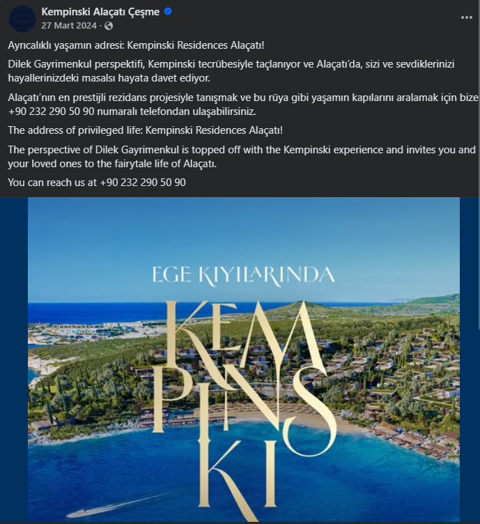Parselde yükselen Kempinski Residences Alaçatı ise rezidans satışı ile gündeme gelmişti. Delikli Koy’da denize sıfır projedeki 1+1 konutların fiyatları 1,3 milyon Euro’dan başlarken fiyatlar 4+1 dubleks konutlarla 3,3 milyon Euro’ya kadar çıktığı ifade edilmişti.