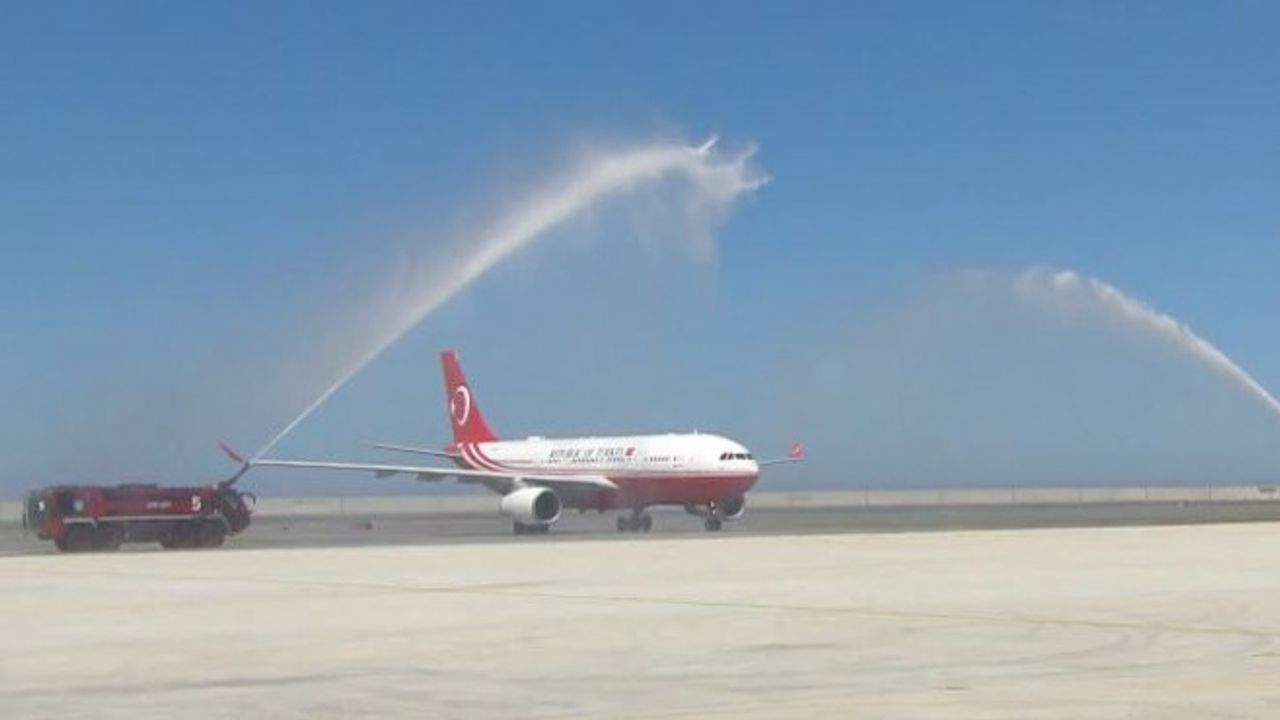 Liderleri taşıyan uçaklar, su takı ile karşılandı. Aliyev'i uçaktan inişinde karşılayan Cumhurbaşkanı Erdoğan, daha sonra mevkidaşıyla açılış töreninin yapılacağı alana geçti.