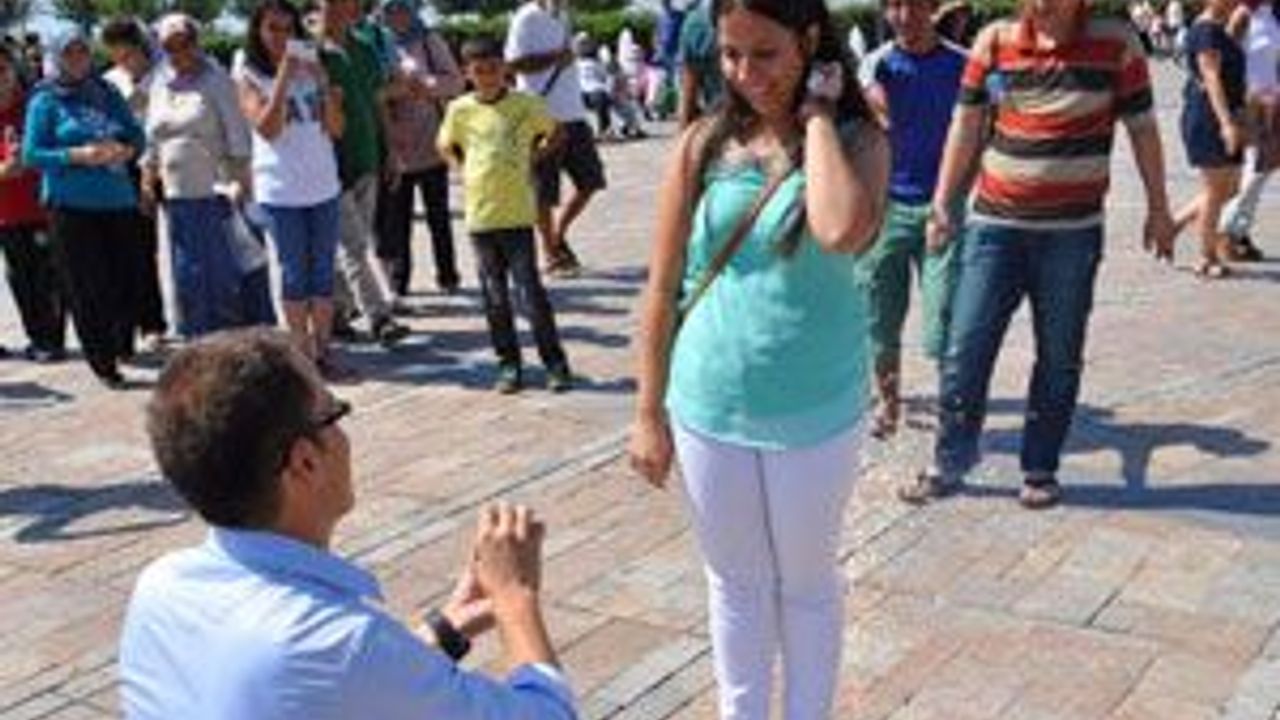 Erdem, yakınlarının ateşlediği maytapların arasında diz çöküp kız arkadaşına evlilik teklifi yaptı. Gözyaşlarına boğulan üniversiteli Tuğçe Ayvaz, erkek arkadaşına sarılıp teklifini kabul ettiğini söyledi. Bunun üzerine Erdem, Ayvaz'ın parmağına tek taş yüzük taktı. Hayatının en mutlu gününü yaşadığını kaydeden Onur Erdem, 'Çok mutluyum, emeği geçenlere çok teşekkür ederim. Hayatımın insanını buldum, gerisi kendiliğinden oldu' diye konuştu. Genç kız, 'Böyle bir şeyi beklemiyordum. Hayatımda tanıdığım en iyi kişi' dedi. Genç çift yakınlarına sarılıp hatıra fotoğrafı çektirerek mutluluklarını paylaştı.(dha)