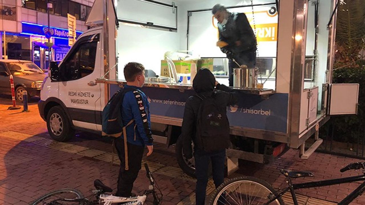 Sabahın erken saatlerinde işlerine ve okullarına gitmek için yola çıkan vatandaşlara Cumhuriyet Meydanı'nda bulunan ikram aracından sıcak çorba ikramı yapılıyor.