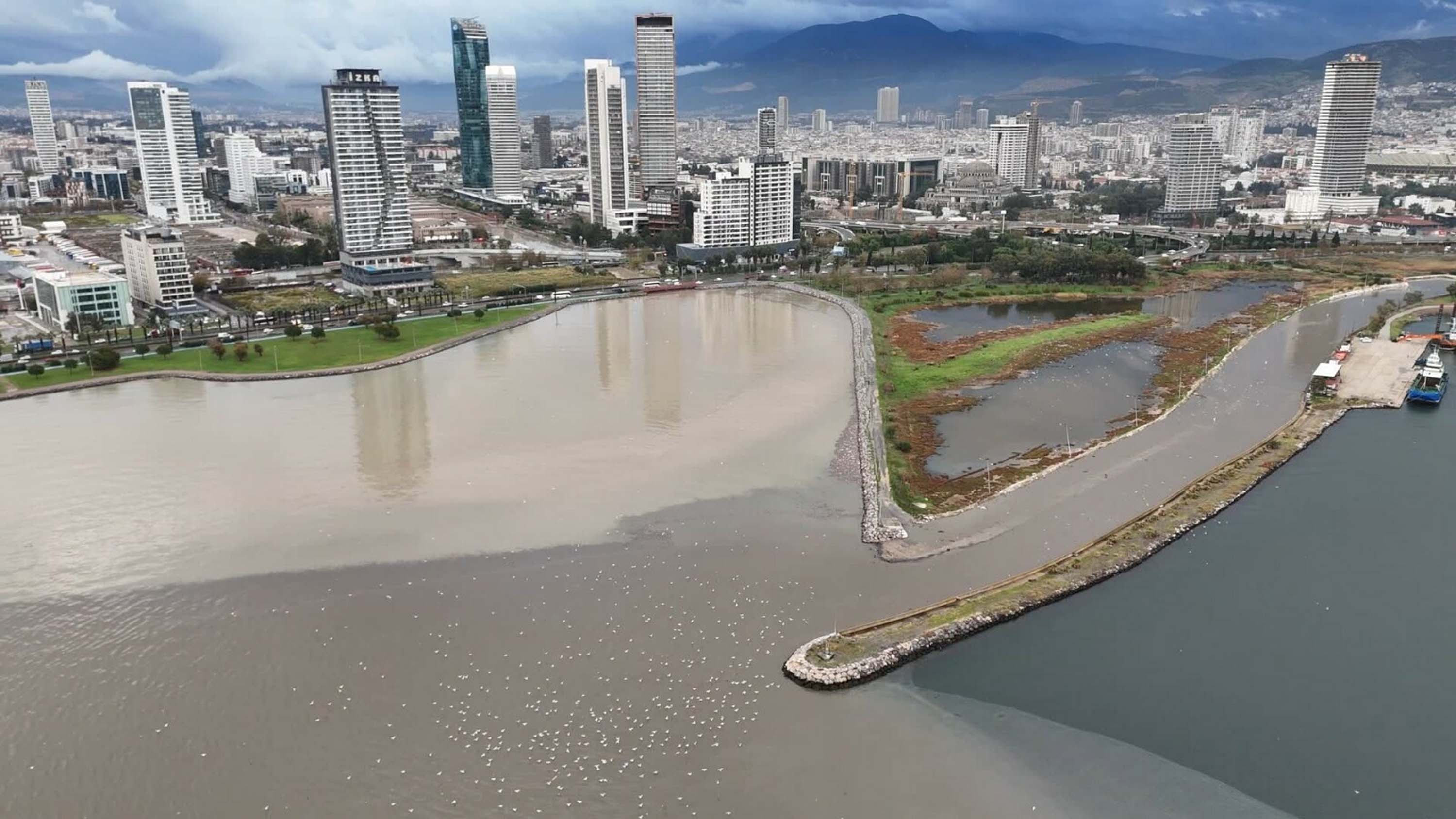 İzmir'de etkili olan gök gürültülü sağanak nedeniyle İzmir Körfezi'nin bazı bölümleri kahverengiye büründü. Derelerden denize akan çamurlu suyun neden olduğu renk değişimi dron ile görüntülendi.