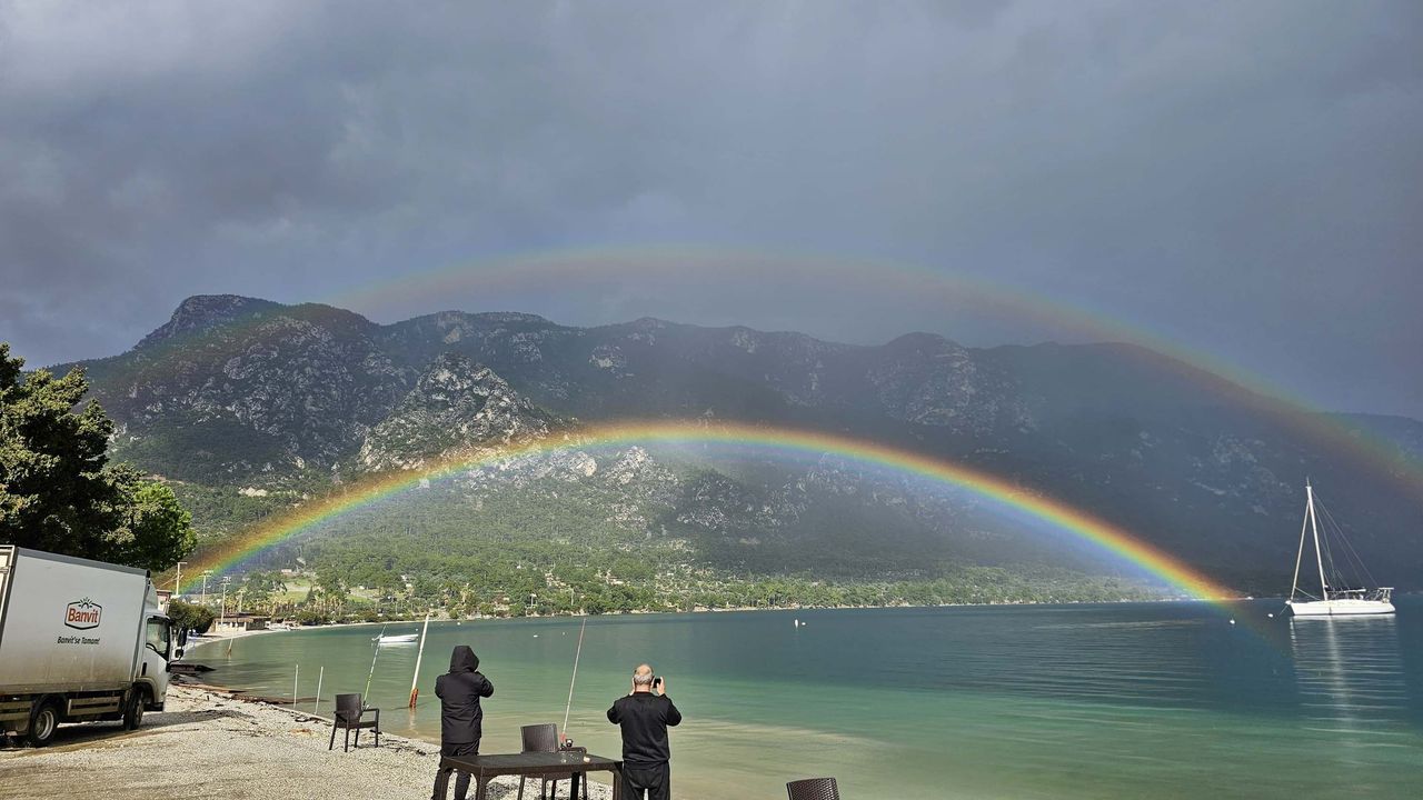 Menteşe ilçesinde dün sabah saatlerinden itibaren sağanak, etkili oldu. Akbük Sahili'nde yağmur bulutlarının bir anda dağılıp güneşin yüzünü göstermesiyle, çift gökkuşağı ortaya çıktı. Çift gökkuşağı görenleri hayran bıraktı. Gökkuşağının sunduğu görsel manzara vatandaşlar tarafından cep telefonlarıyla kaydedildi.(DHA)