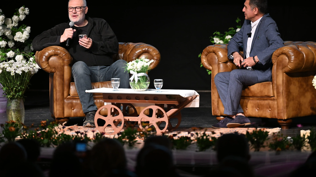 Etkinlik kapsamında ‘Dionysos Sanata Emek Ödülü’ verilen Tiyatro Sanatçısı Levent Üzümcü de Tuğrul Keskin ile bir söyleşi gerçekleştirdi. Üzümcü, konservatuarda oyunculuk bölümünde okurken şiir akşamları düzenlediğini anlatarak, “Eskişehir Anadolu Üniversitesi Devlet Konservatuvarı’nın, içinde sadece halı olan salonunda oturup o kadar geçim zorluğu içinde yaşayan üniversite öğrencileri olarak, gecemiz gündüzümüz hep şiirdi. Biz şairlerin içine doğmuştuk. Fark edememiştik. Onların sözünün kıymetini fark edebilmek için okulda birbirimize onların sözlerini söyledik. Benim için sadece şiirin dünyasını tanımak değil, şairlerin de dünyasını tanımaktı. Sonra sonra fark etmeye başladım. Hayatında her zaman sanatı hep bulundurmuş birisi olarak, şiirin içine girdiğimde fark ettim şiiri ne kadar ıskalamış olduğumu. Genellikle şiiri dinliyoruz, beğeniyoruz. Arkadaş sohbetlerinde, dost masalarında okuduğumuz şiirler var. Bizim bir parçamız gibi. Fakat şiirin dünyasına girdiğinizde karşınıza çıkan her bir kelimenin şairin hayatında neye denk düştüğünü bilmek, ister istemez sizi bir süre sonra küçük bir araştırmacı haline getiriyor. O kadar mutluyum ki. Bu kadar sevdiğim bir şeyin başat olduğu bir coğrafyada yaşıyorum” şeklinde konuştu.