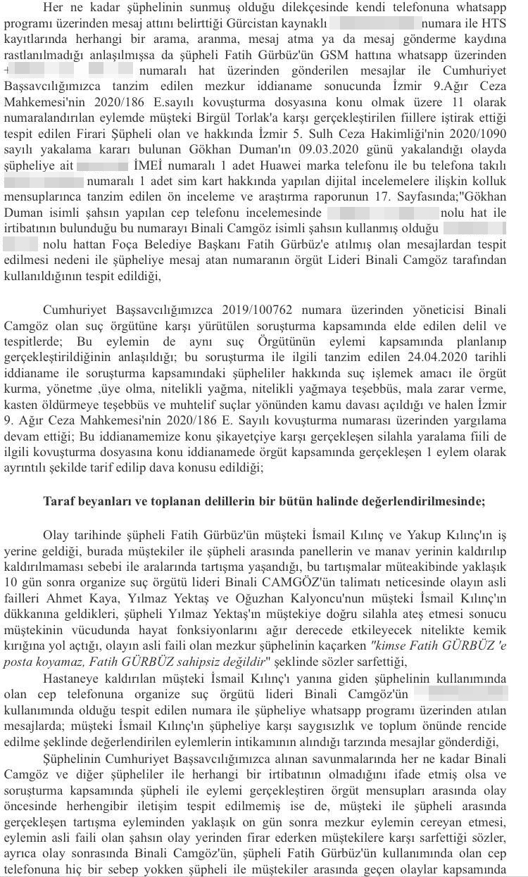 Savcı Kayıran, yaptığı değerlendirmede Gürbüz'ün açıklamalarının hayatın olağana akışına aykırı olduğunu, silahlı eylemi gerçekleştirilen kişilerle mağdurların hiçbir iletişim ve bağlantısının bulunmadığını fakat Başkan Gürbüz'e mesajlar geldiğini, organize suç örgütünün üyelerinin telefonuna çağrılar ve aramalar bıraktığını anlattı.