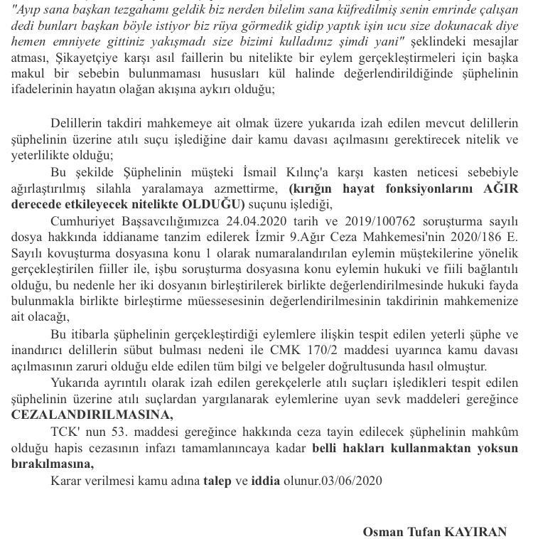 Cumhuriyet Savcısı Osman Tufan Kayıran bacaklarından vurulan İsmail Kılınç'ın kardeşi Yakup Kılınç'ın başvurusu ve ifadeleri üzerinden yeni bir iddianame hazırlayarak İzmir Ağır Ceza Mahkemesi'ne gönderdi. 10 Ağustos'ta gerçekleştirilecek duruşma öncesinde davaların birleştirilmesini isteyen savcılık Başkan Gürbüz'ün 'müşteki' olan durumunu 'şüpheli' sıfatına çevirdi.