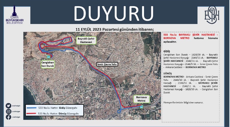 İzmir Büyükşehir Belediyesi, kent içi otobüs ulaşım ağı olan ESHOT'a Şehir Hastanesi için yeni bir hat planladı. Bornova Metro kalkışlı olan yeni hattın 533 No'lu hat olacağı duyuruldu. Bayraklı Şehir Hastanesi – Bornova Metro arasında çalışacak olan hat, 11 Eylül tarihinden itibaren hizmete girecek.