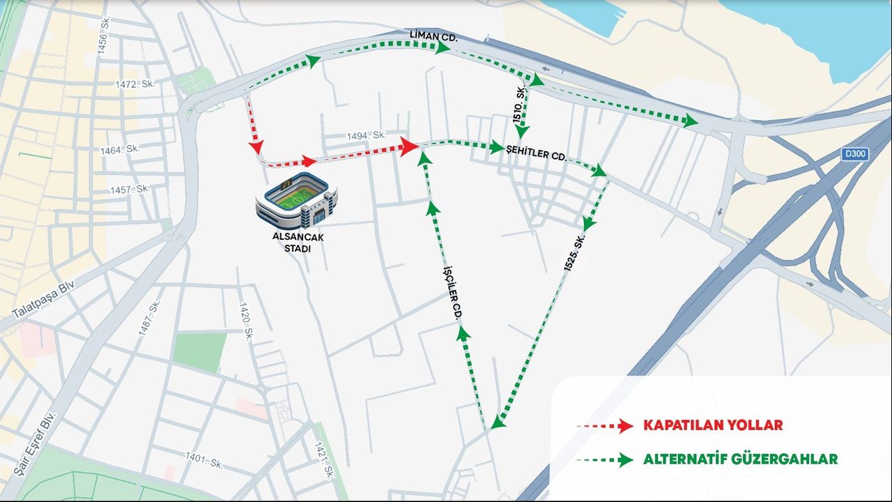 Araç sürücüleri trafiğe kapatılan Şehitler Caddesi yerine Liman Caddesi, 1510 Sokak, 1525 Sokak, İşçiler Caddesi güzergâhlarını kullanabilecek.
