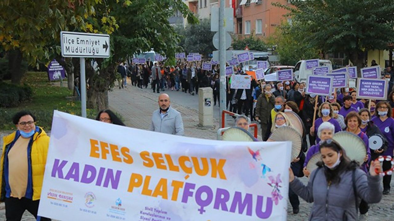 Efes Selçuk Kadın Platformu tarafından kadına yönelik şiddete karşı farkındalık oluşturmak amacıyla düzenlenen yürüyüş programı Artemis Heykeli önünden başladı. Kent sokaklarında sloganlar, şarkılar ve ıslıklarla süren yürüyüş İstasyon Meydanı'nda son buldu. Esnaf ve vatandaşlar da yürüyüşe alkışlarla destek verdi.